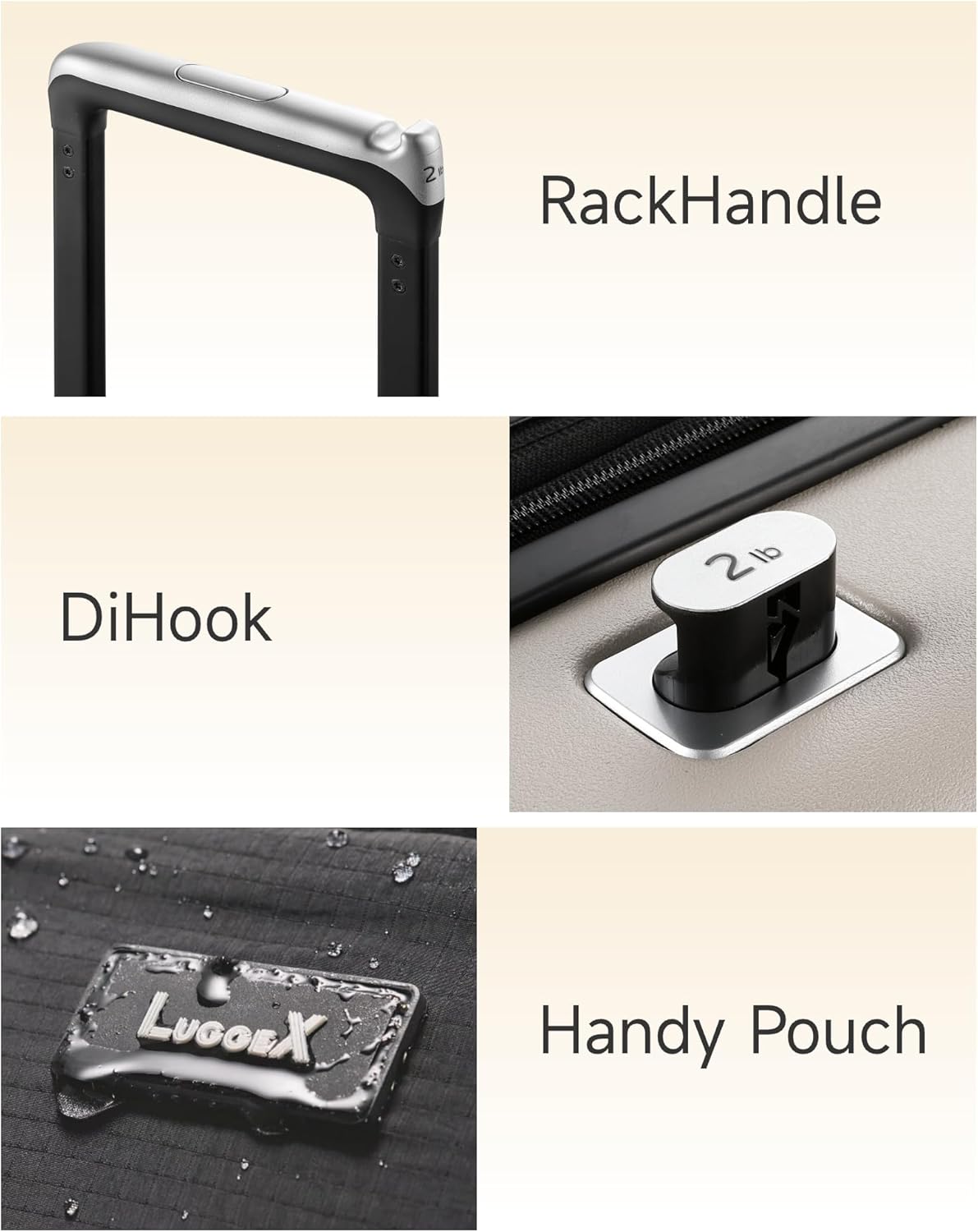 - Free Your Hands – HUP3 carry-on suitcase features an integrated rack handle and Dihook, providing a seamless storage solution. The rear Handy Pouch keeps your essentials secure and within reach.