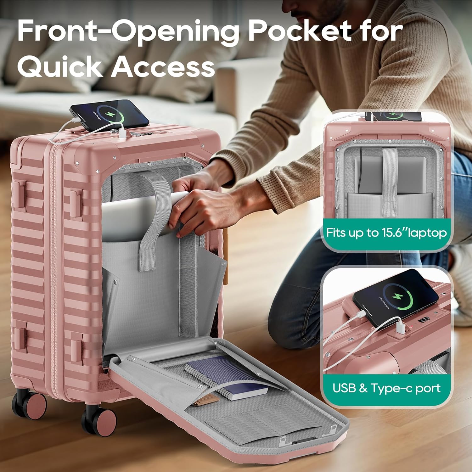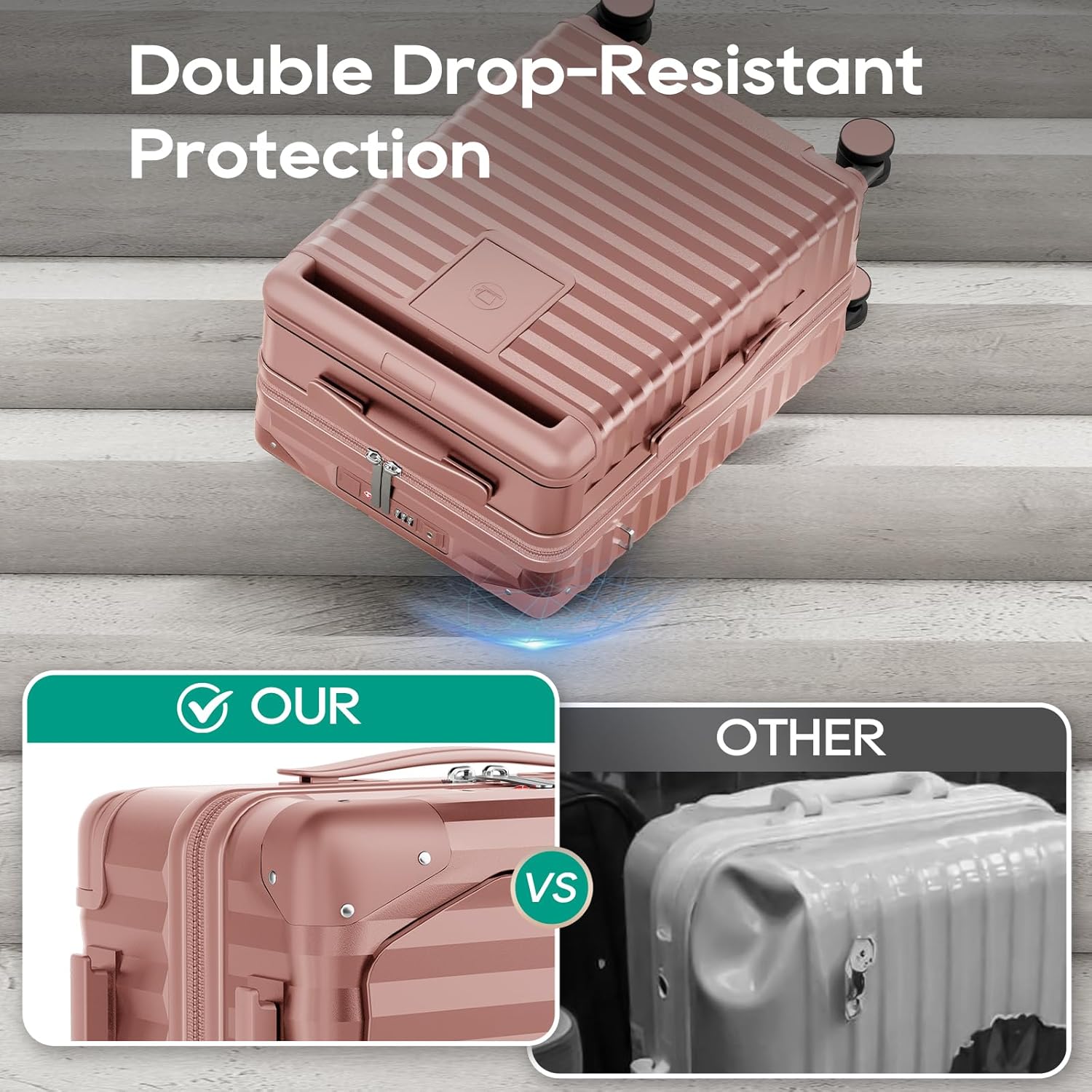 Joyway 20 Inch Carry on Luggage with Front Pocket, PC Hardshell Carry-on Suitcase with USB Port and Cup Holder, 21.5x14.2x9 Airline Approved, Luggage with Spinner Wheels and TSA Lock (Rosa Gold)
